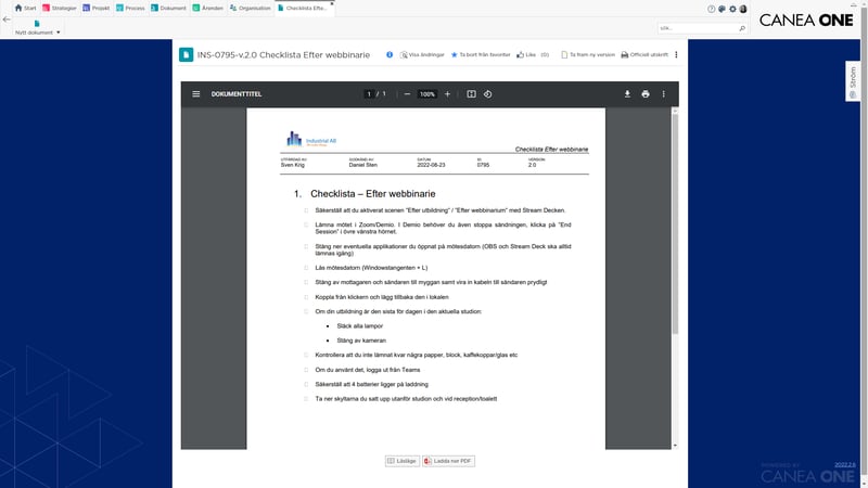 CANEA ONE är det lättillgängliga ledningssystemet som ger medarbetarna stöd och styrning i vardagen. Dokument, projekt, processer och mål är bara en knapptryckning bort tack vare smarta sökfunktioner, grafisk navigering och virtuella mappar. Det ger er ett levande ledningssystem där även sällananvändare trivs.